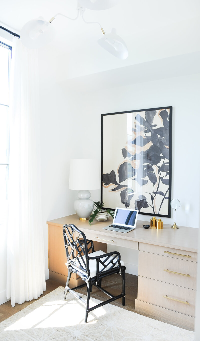 A modern new build perched on the hill overlooking Kelowna, BC, Kerrisdale Design took its cue from the architecture when it came to furnishing the home. Always striving to layer in warmth and texture even in a modern environment, special care was taken to ensure the space felt inviting and cozy rather than stark. Natural fiber rugs in geometric patterns are layered with tailored modern upholstery in velvets and linens. The palette is purposely neutral and light, keeping the focus on the dramatic dark-framed windows and the view beyond. Black was used as an accent to create drama and focal points, and touches of brass add sheen and elevate the space